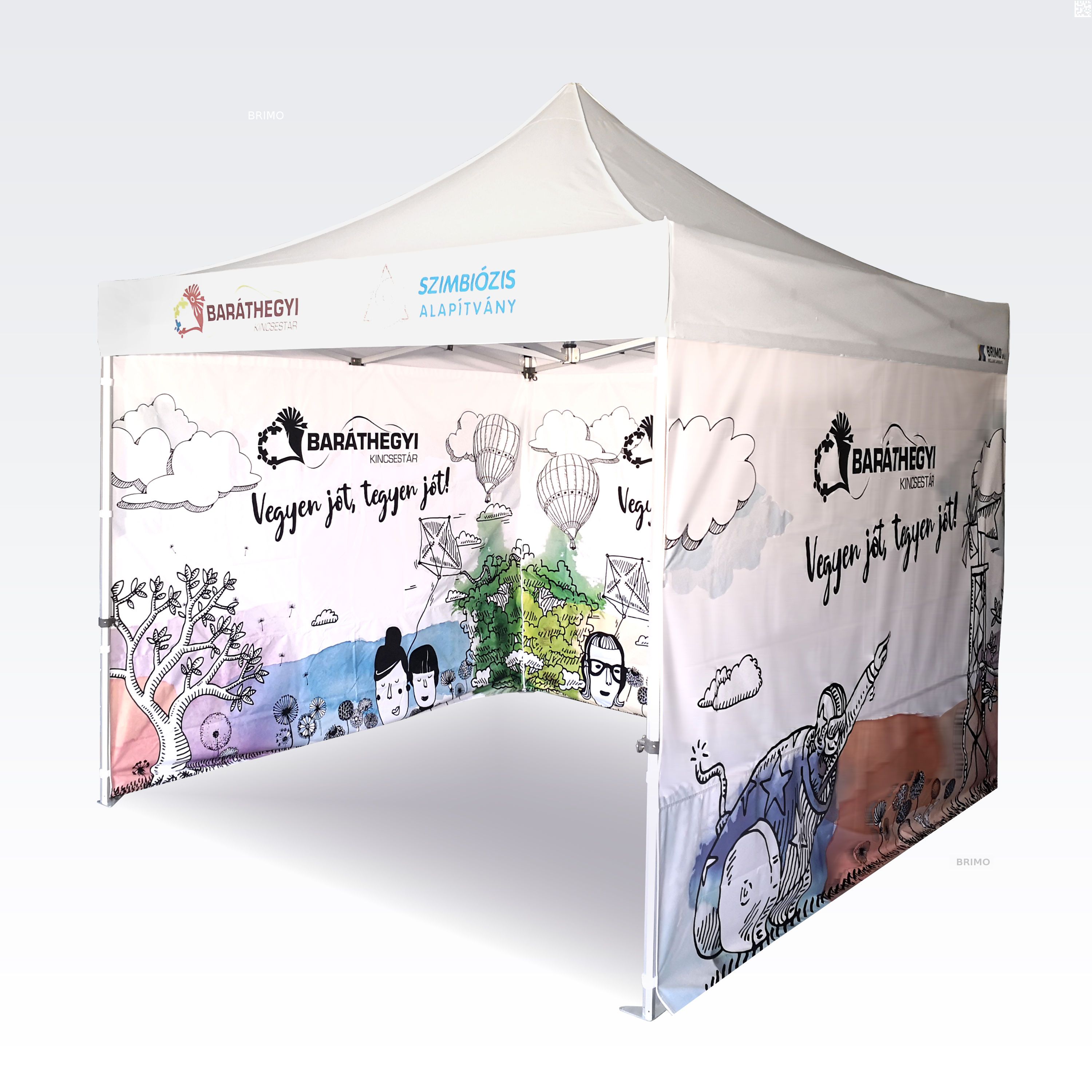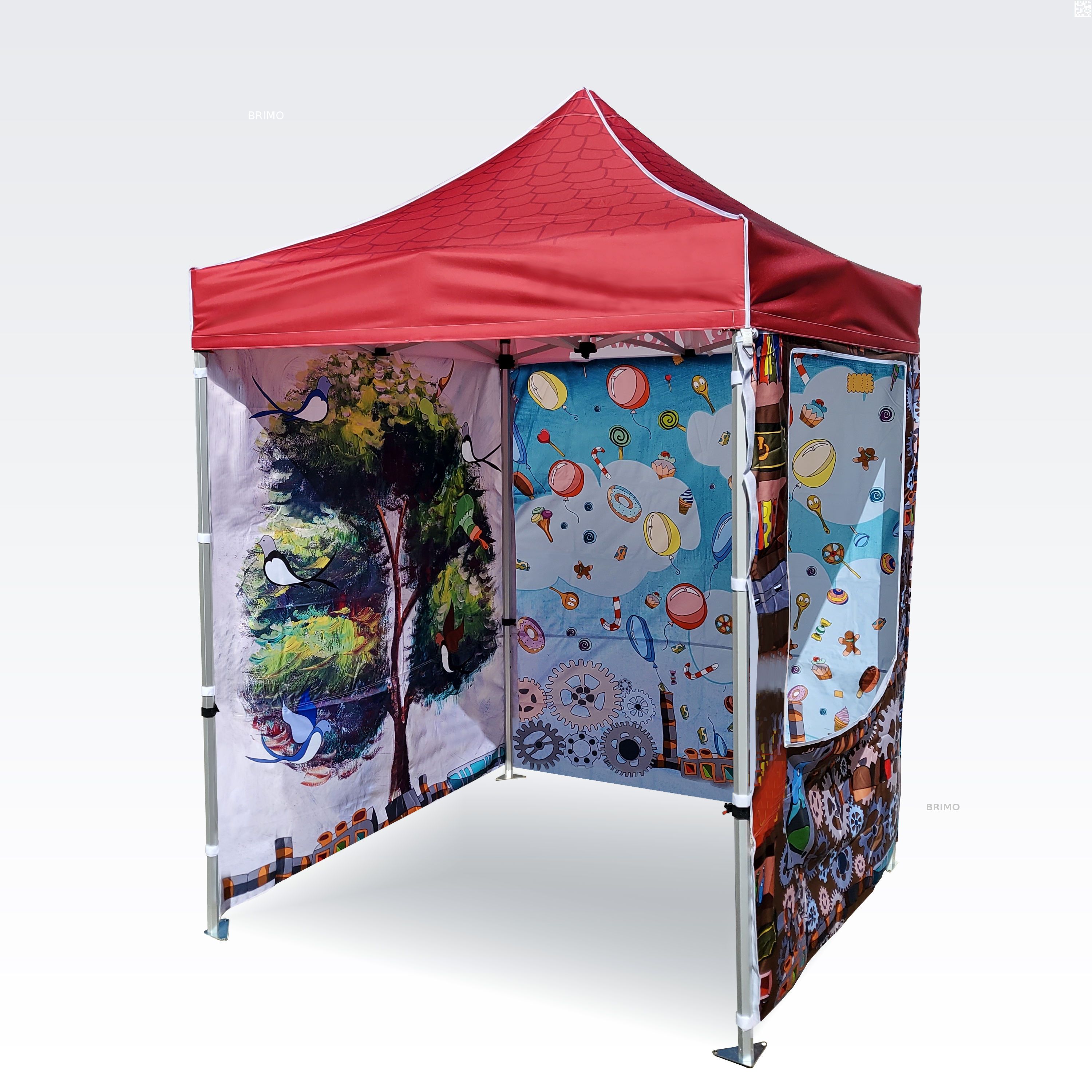 Reklamtält med digitalt sublimeringstryck. Trycket skapas under en kemisk process, bläcket tränger direkt in i tygets struktur under påverkan av hög temperatur. Logotyp, inskription, vilken typ av grafik som helst på insidan eller utsidan av tältet, enligt kundens önskemål.
